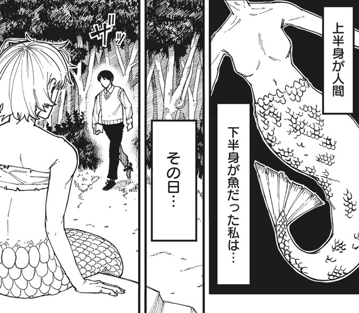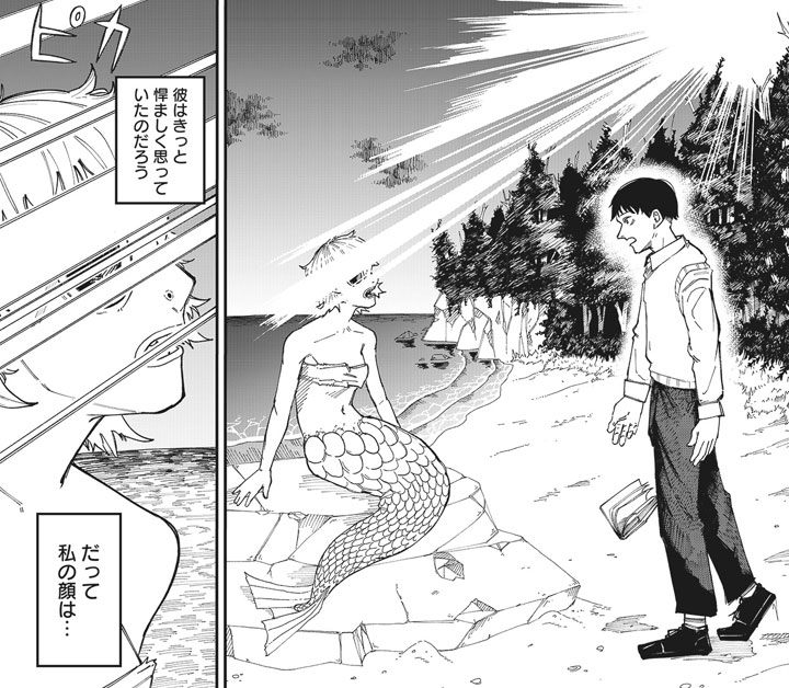 そのために、この作品の肝でもある「人魚の顔まで魚」というコンセプトを1番振りかぶって見せられる形を模索し、実行しています。具体的な方法は、1~3ページ目で読者が見たいであろうヒロインの顔をあえて隠し、4ページ目で魚の恐い顔を大きく見せることでインパクトを強めました。