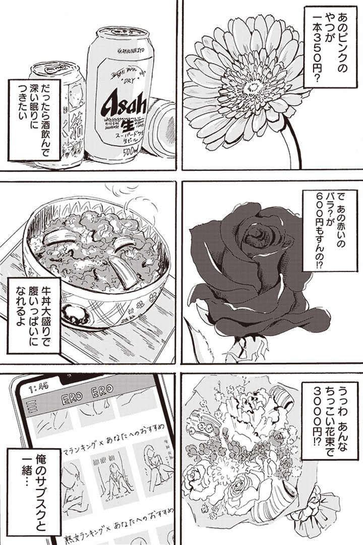 - 本作では、物語の序盤2ページに主人公の価値観が明確に提示されています。例えば「350円があったら花を一本買うのではなく、お酒を買う」「600円あれば牛丼を選ぶ」といった三大欲求と照らし合わせた具体的なエピソードを通して、主人公が“花”をどのように捉えているのかが示されています。同時に主人公の寂しげな表情も描かれていることで、彼の価値観が虚しいものだと表現されていました。