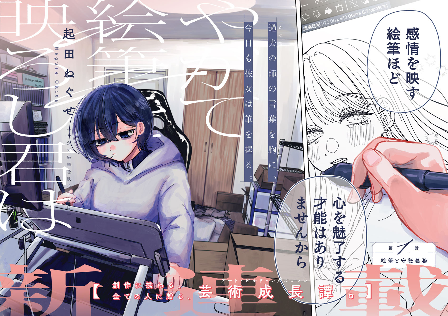 過去の師の言葉を胸に、今日も彼女は筆を握る。感情も、欲望も、全部この線に閉じ込めて──。創作に携わる、全ての人に送る、芸術成長譚。『やがて絵筆を映ろし君は』巻頭カラーで連載開始! ファミレスで打ち合わせをする漫画家・藍川あいりだが……?